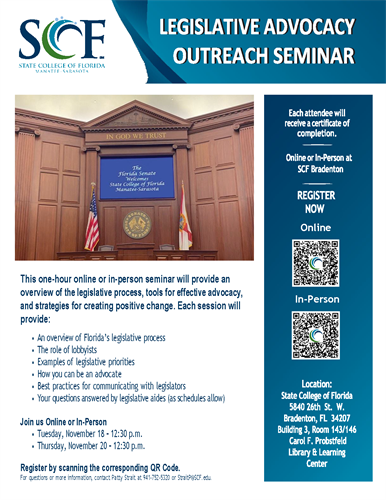 The Government Relations department at State College of Florida is excited to offer FREE Legislative Advocacy Outreach training open to the public, SCF faculty, staff, local Chambers and the community. This online or in-person, one-hour seminar will provide an overview of the legislative process, tools for effective advocacy, and strategies for creating positive change. Each session will provide: