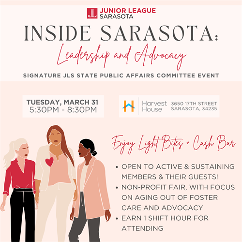 The Junior League of Sarasota, State Public Affairs Committee is proud to present Inside Sarasota: Leadership and Advocacy. This year’s event will feature a Nonprofit Open House highlighting wonderful local organizations, including many that support youth aging out of foster care, the Junior League of Sarasota’s signature focus area. This event is FREE and open to the public, and offers community members the opportunity to engage with nonprofits, volunteers, and advocates committed to making a difference in Sarasota. The evening will bring together community leaders, public officials, and supporters while showcasing the vital work being done to serve vulnerable young people in our region. Attendees will connect with these organizations and explore meaningful ways to get involved through volunteer opportunities, board service, or advocacy.